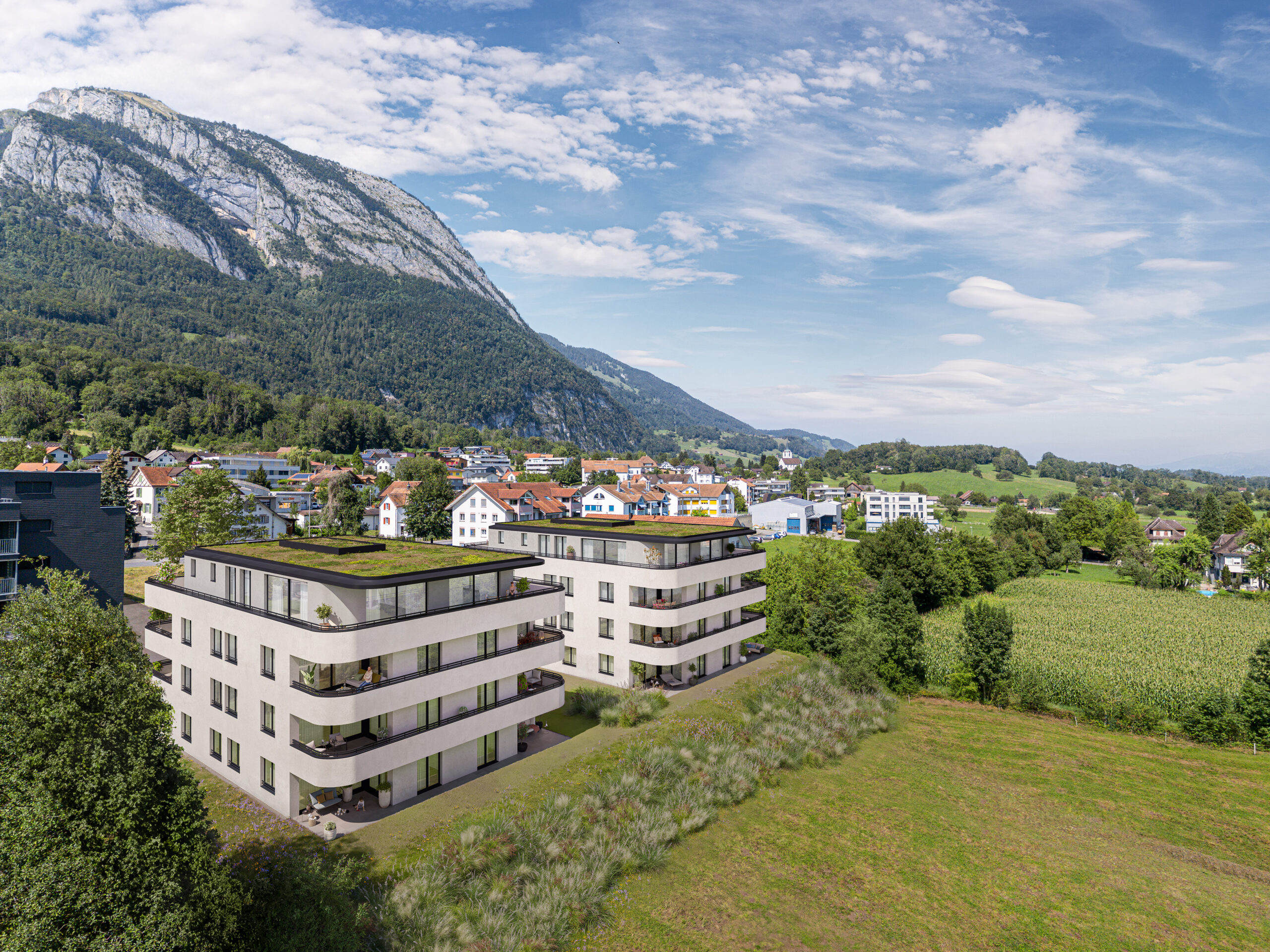 In Sennwald realisieren wir zwei Mehrfamilienhäuser mit insgesamt 22 Eigentumswohnungen sowie 30 Tiefgaragenparkplätzen. Die Wohnungen überzeugen durch eine optimale Besonnung und eine attraktive Weitsicht.